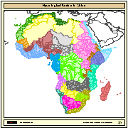 Major hydrological basins and their sub-basins. This dataset divides the African continent according to its hydrological characteristics. The dataset consists of the following information:- numerical code and name of the major basin (MAJ_BAS and MAJ_NAME); - area of the major basin in square km (MAJ_AREA); - numerical code and name of the sub-basin (SUB_BAS and SUB_NAME); - area of the sub-basin in square km (SUB_AREA); - numerical code of the sub-basin towards which the sub-basin flows (TO_SUBBAS) (the codes -888 and -999 have been assigned respectively to internal sub-basins and to sub-basins draining into the sea)
